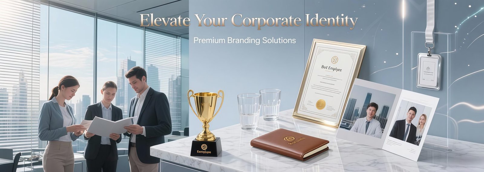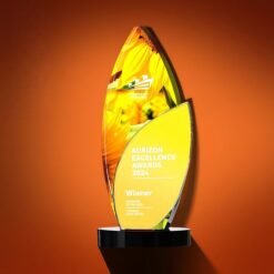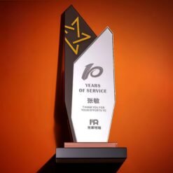 The trophy can be customized with text and is made of artificial crystal and mirrored glass