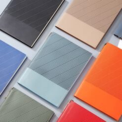 Customized corporate notebook, striped cover, PU material, with company logo and slogan printed on it