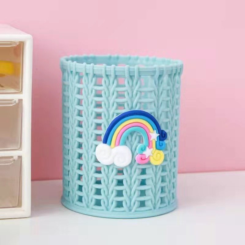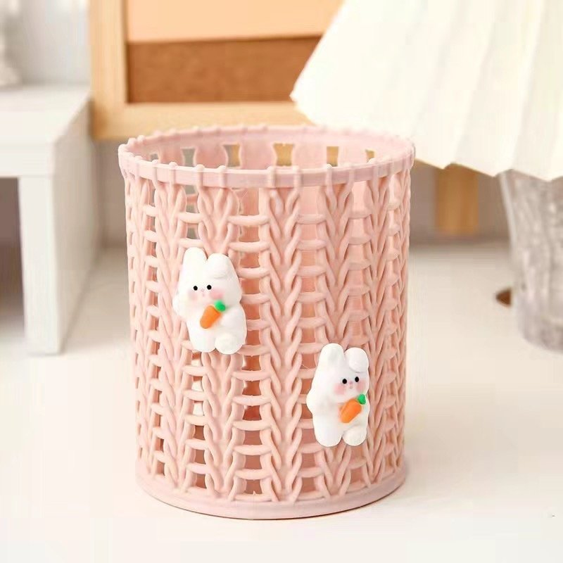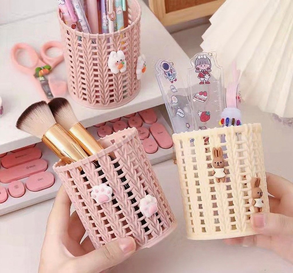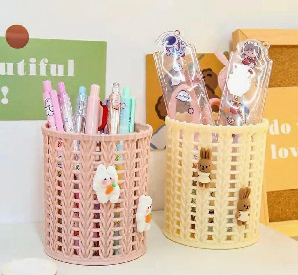 It’s made of PP material, which is lightweight and durable. The pen holder is designed in a hollow woven style. It not only looks great but also allows you to see the stationery inside at a glance, making it super convenient to take. There are also cute cartoon decorations, such as little rabbits and paw prints, which add a lot of fun and vitality to the monotonous desk and instantly make the desk lively.