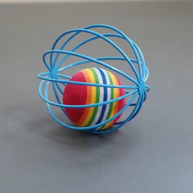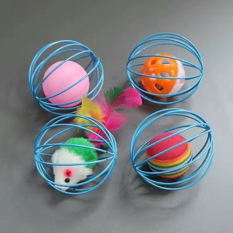 Four blue metal hollow balls, each hiding a surprise: a pink bouncy ball, a jingly colorful ball, a fuzzy mouse, and a rainbow – striped ball. Plus colorful feathers—visual, tactile, and auditory stimulation in one! Instantly triggers your cat’s hunting instincts. They’ll chase, bat, and pounce—endless play styles!