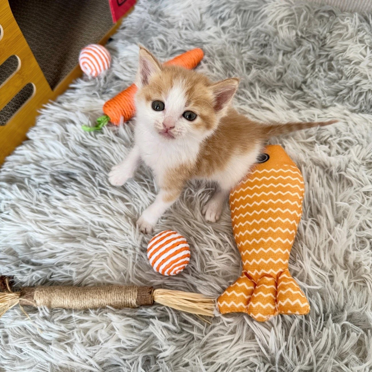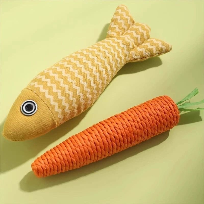 Check out the hemp rope carrot—super realistic and perfect for chewing and scratching, satisfying your cat’s hunting instincts. And this “delicious fish” with soft fabric and lifelike patterns? Your cat will bite, knead, and play non – stop! The sisal post in the middle, made of natural material, is great for claw – sharpening without damage, letting your cat stretch out. The two – tone woven ball makes a rustling sound when rolling, instantly triggering your cat’s chasing urge for indoor fun.