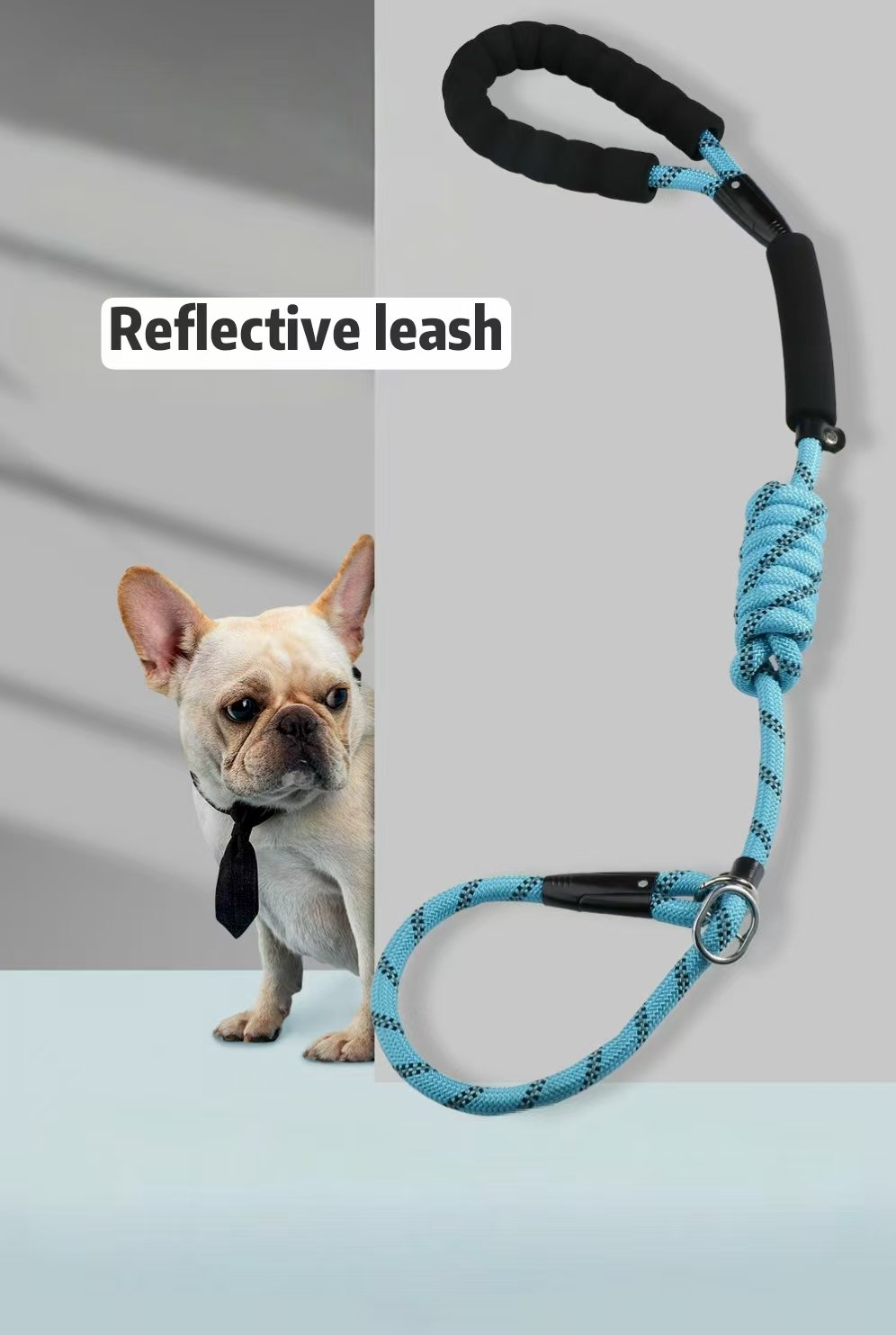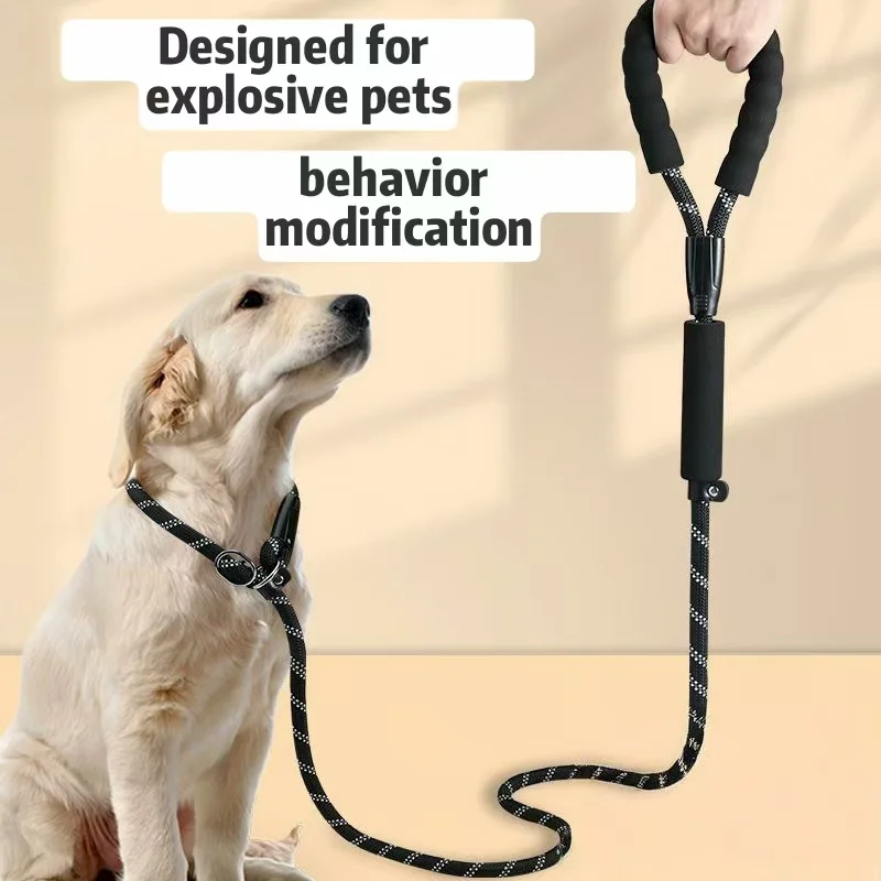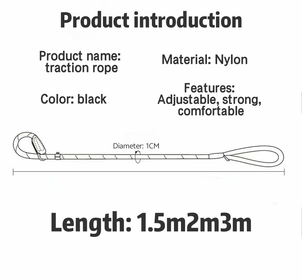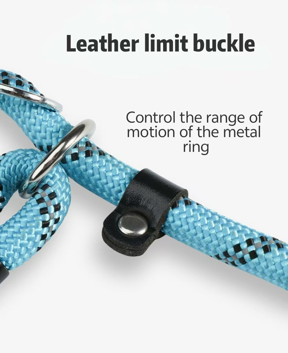 This leash is made of black nylon. It has a 1 cm diameter and is available in 1.5, 2, and 3 meter lengths. It features an integrated leash collar for easy adjustment and an integrated P-chain to prevent your dog from jumping on you. The handle is made of soft sponge for a comfortable grip. It also has a leather limiter to control the range of motion of the metal loop. It also features 3D reflective strips for added safety during nighttime walks. The overall durable design ensures convenient and safe dog walking.