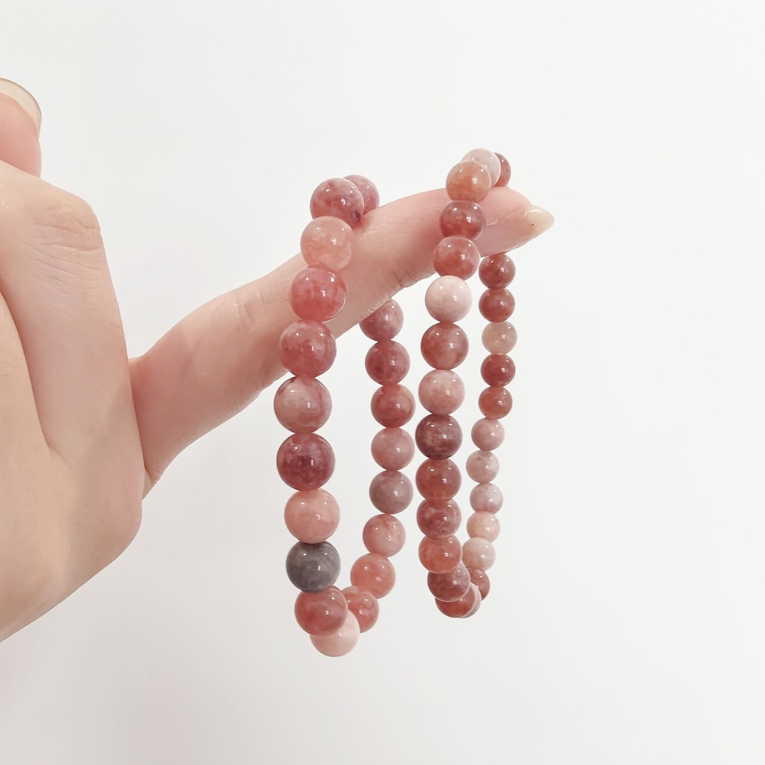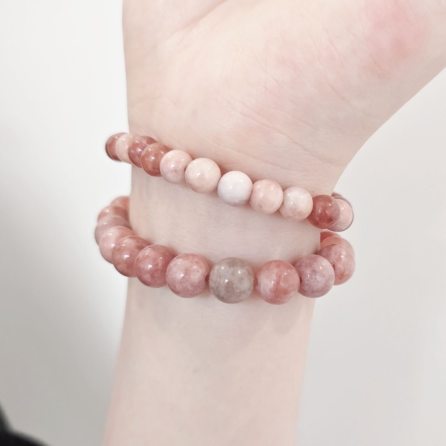 Made of natural stones, each bead is carved by nature. Their textures and colors are all one – of – a – kind, just like us in the huge crowd, with exclusive stories. The light – pink bracelet is like spring flowers blooming gently, tender and bright. Wearing it, it’s as if you tie the romance of cherry blossom season on your wrist. The deeper – pink one is like the slightly tipsy sunset in the afternoon, rich yet delicate, adding a unique charm to your outfit.