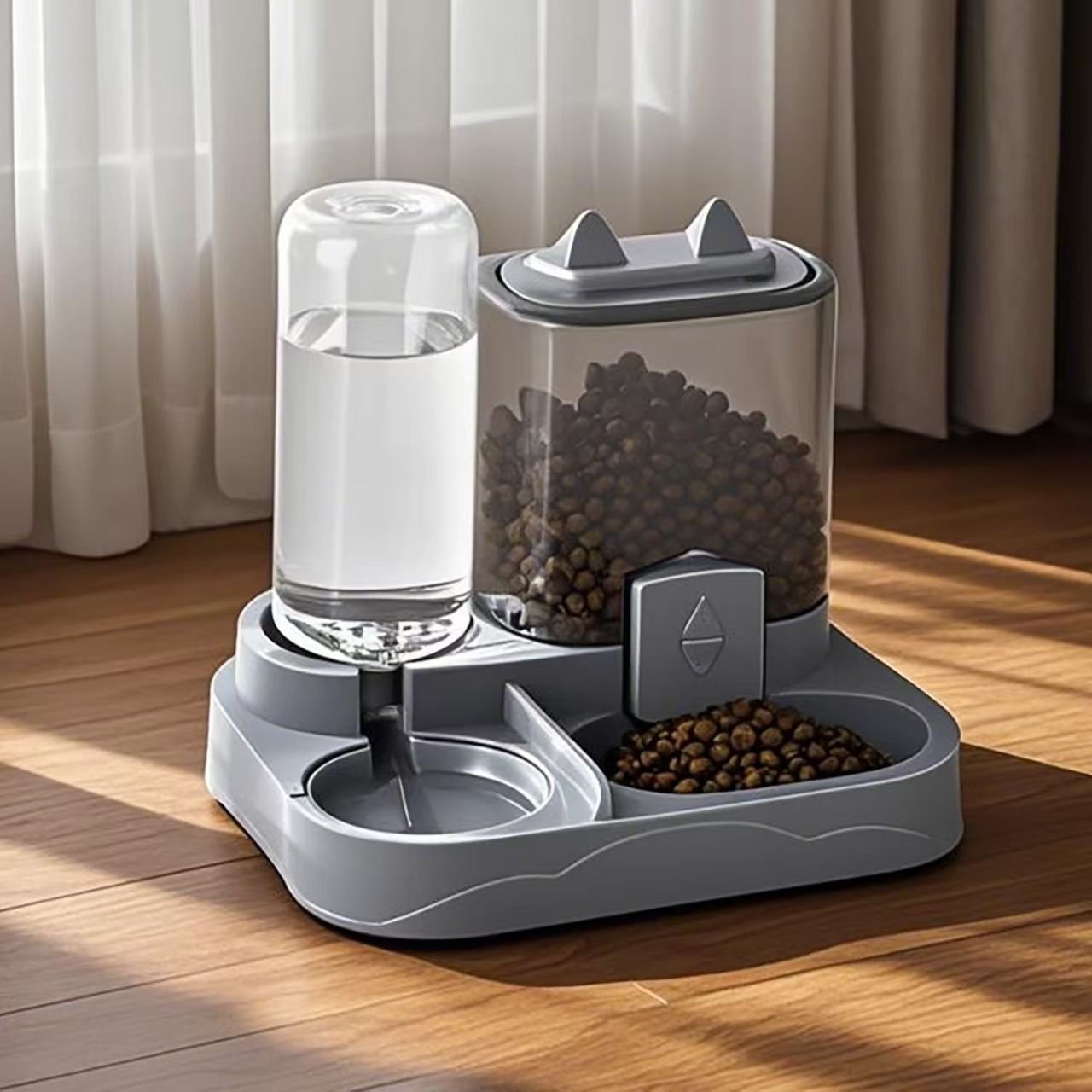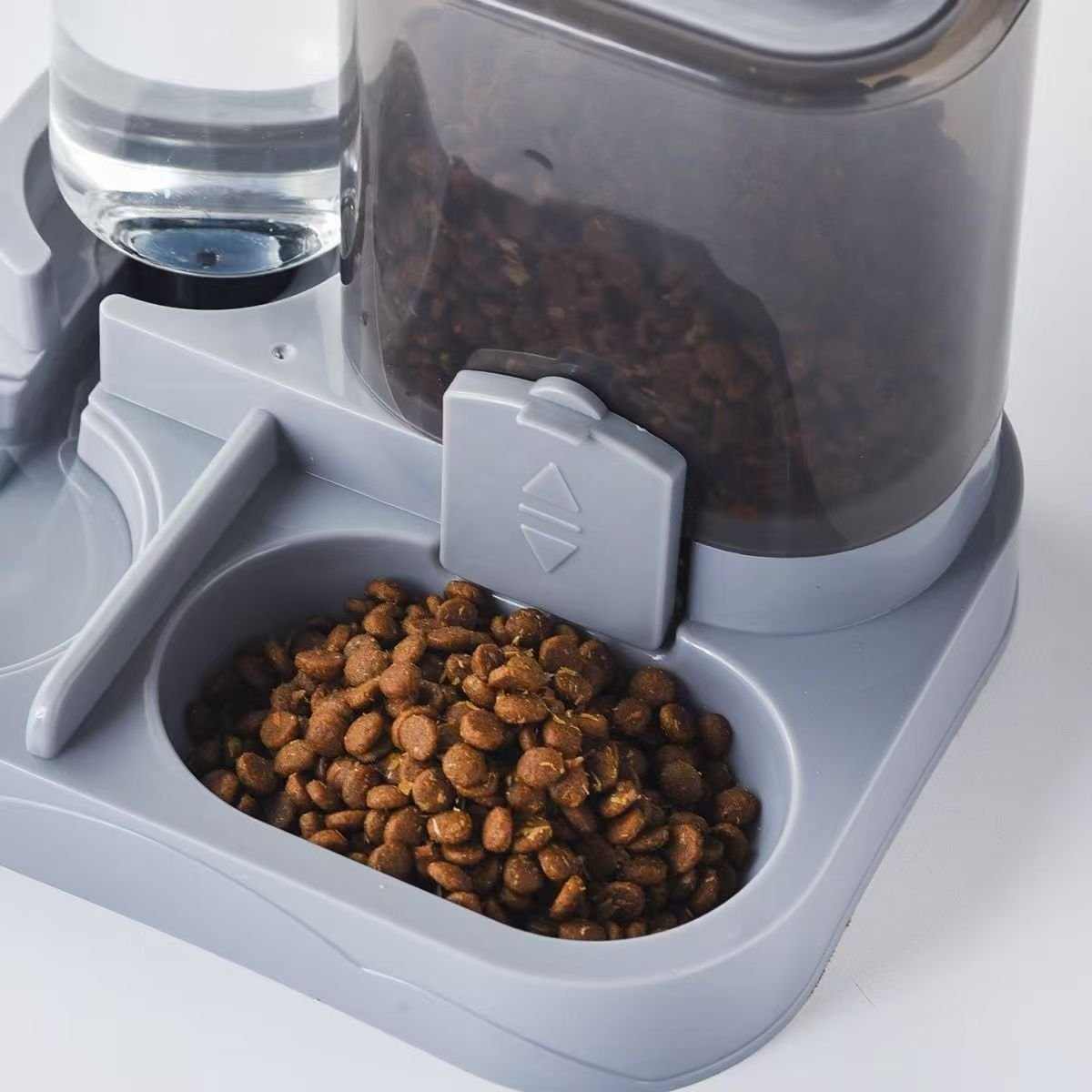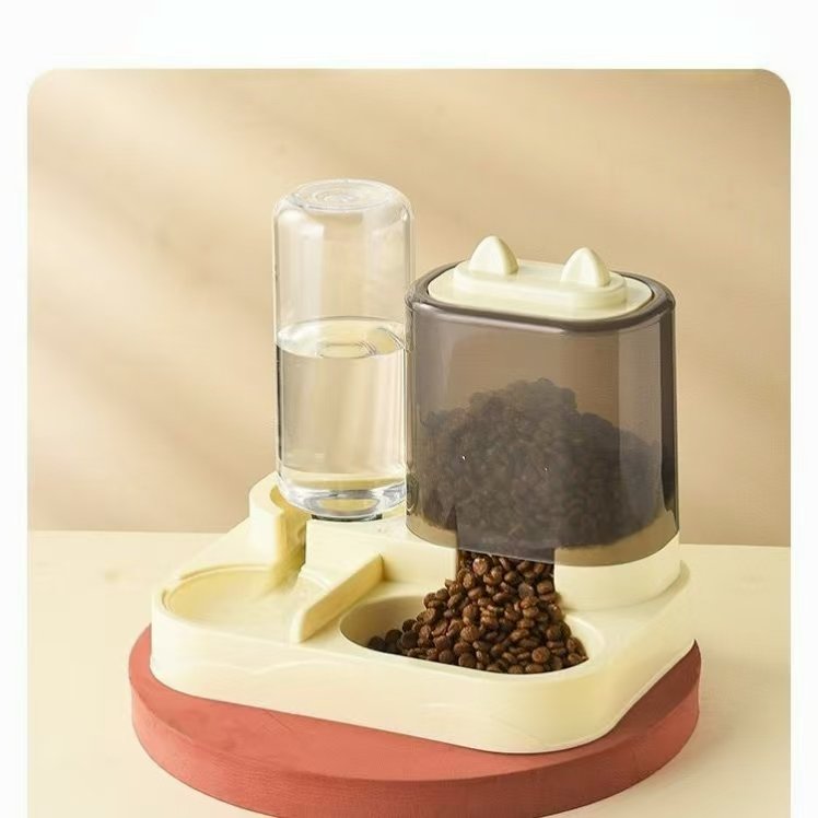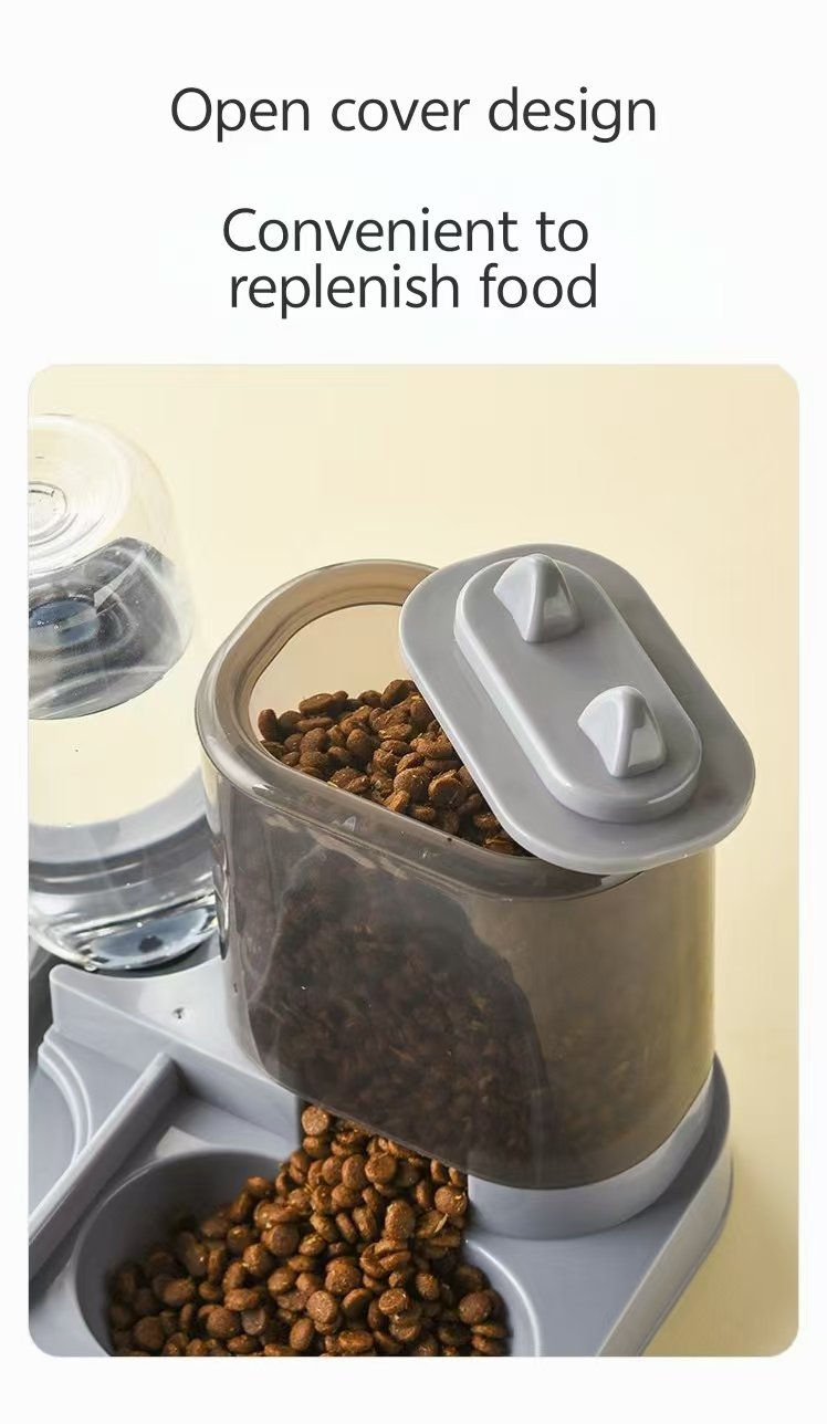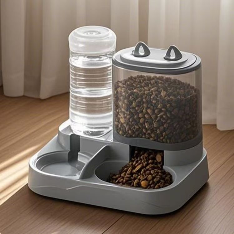 This pet water and feeder is thoughtfully designed and practical, combining both drinking and feeding functions. The grain storage bucket on the right features an open lid for easy refilling, which automatically drops into the food bowl below. The transparent drinking bottle on the left uses a siphon design, providing a continuous supply of fresh water for your pet. The overall design is simple and elegant, measuring 21.8 cm long, 17 cm wide, and 18.5 cm high, making it a convenient size that takes up minimal space. Made of safe and reliable materials, it’s easy to clean and maintain, ensuring it meets your pet’s dietary needs for both daily use and short trips, providing great convenience for pet owners.