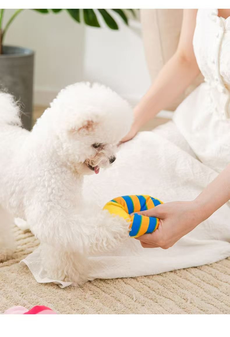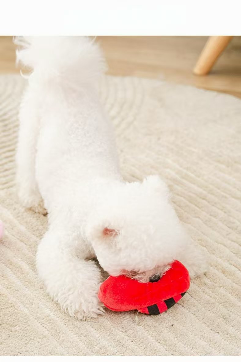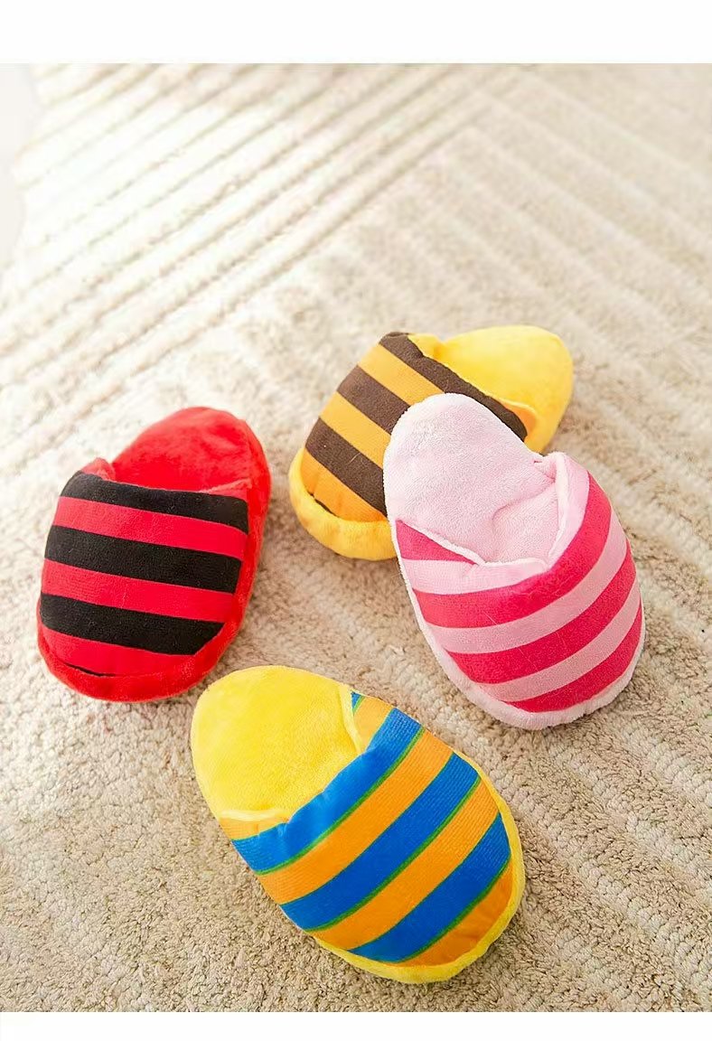 These adorable slipper-shaped pet toys sit on a light brown carpet. These slipper-shaped toys are exquisitely designed. They feature vibrant stripes in various styles, some wide, some narrow, creating a harmonious and varied combination. Made of soft, comfortable material, these toys are perfect for pets to chew and play with, satisfying their teething needs. Their adorable appearance also adds a touch of fun to pets’ lives, making them the perfect companions.
