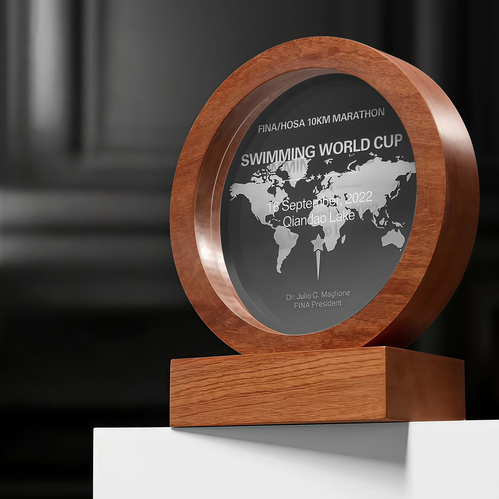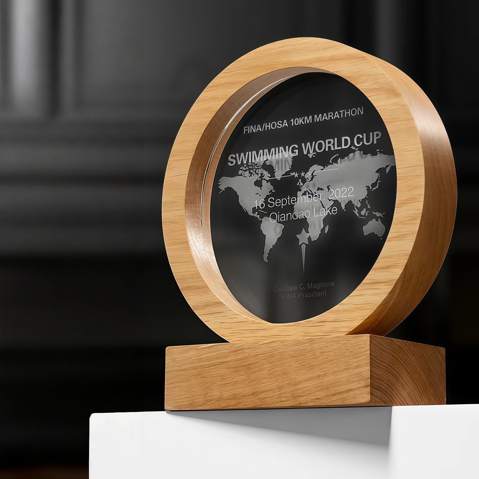 The trophy can be customized with text and is made of artificial crystal and mirrored glass