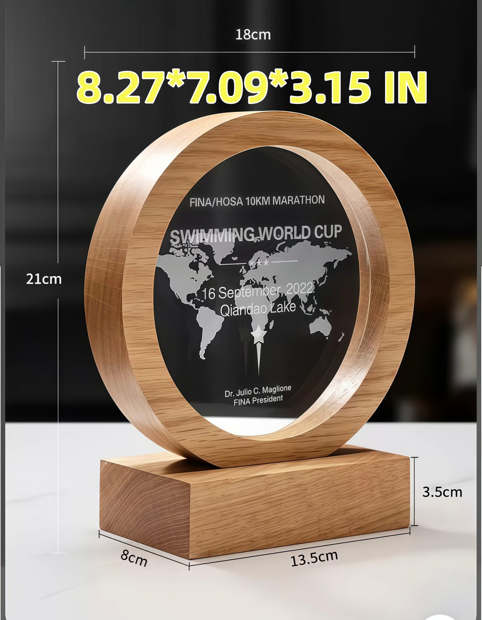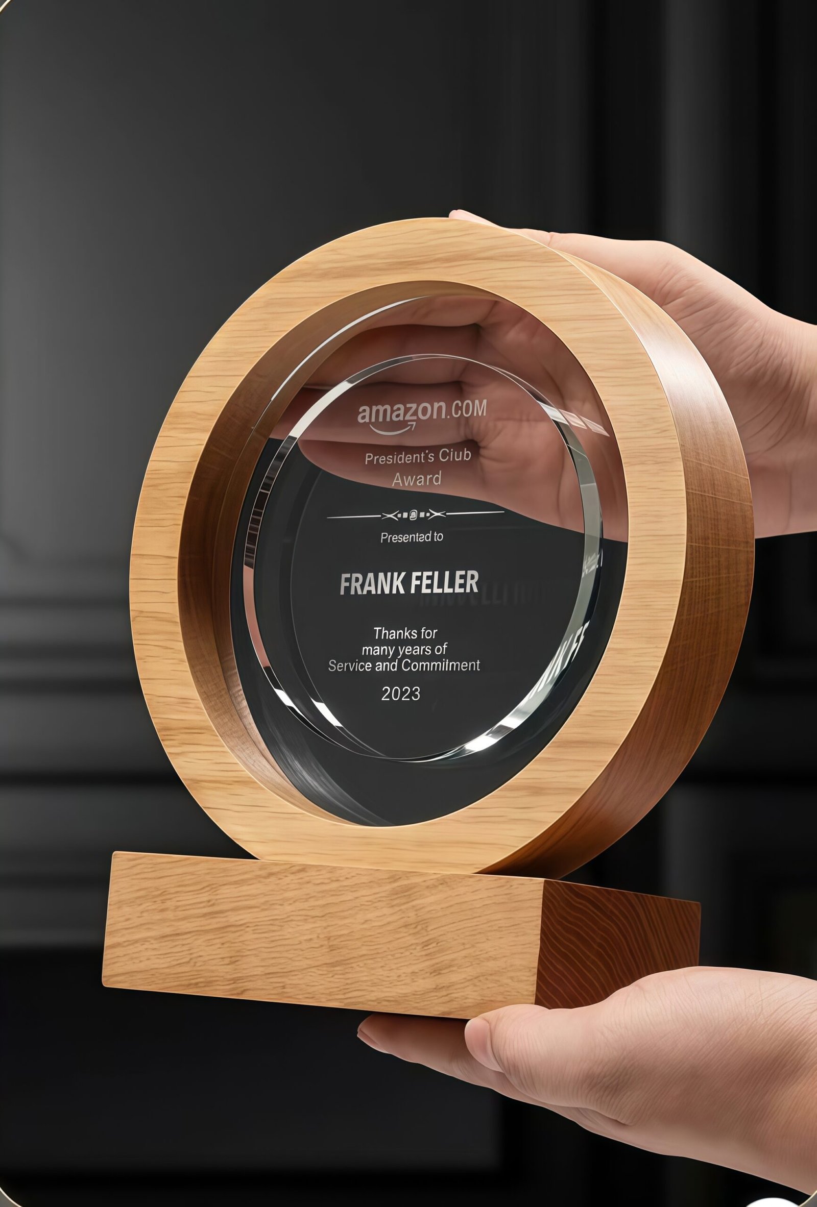 The trophy can be customized with text and is made of crystal and white oak